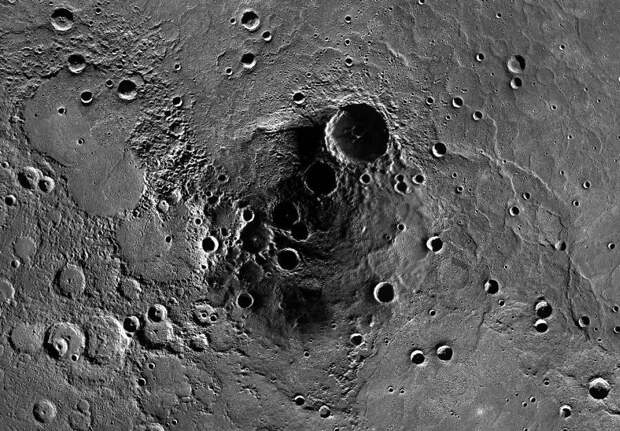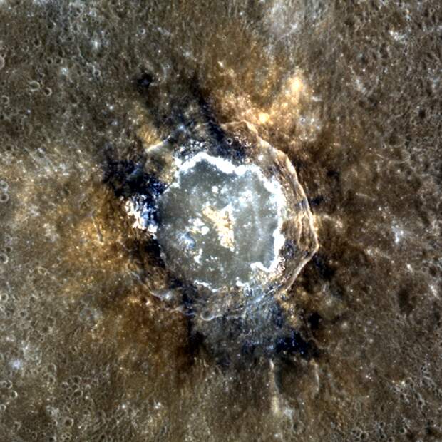 Это кратер Прокофьева на северном полюсе Меркурия. В тени этого кратера АМС Мессенджер обнаружил огромные залежи льда. Либо кратер образован от падения кометы, либо этот кратер – грязевой вулкан.