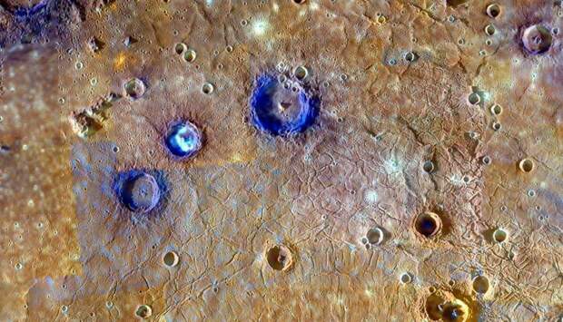 Столкновение с такими массивным телом уничтожило бы Меркурий или сильно его деформировало. Если увеличить изображение или открыть более детальные снимки этого места, то можно увидеть трещины на поверхности, которые напоминают трещины в пересохшей луже в пустыне или глине: