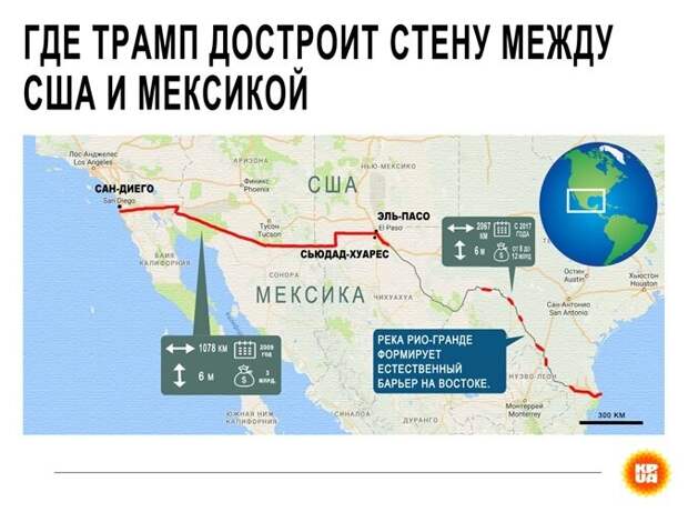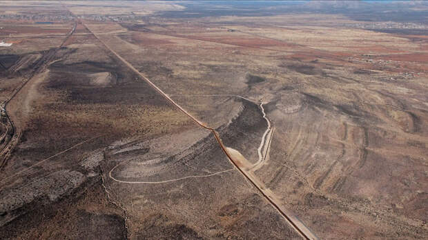 Американо-мексиканская стена с большой высоты. Карта, где при Трампе собираются достроить стену (второй слайд).