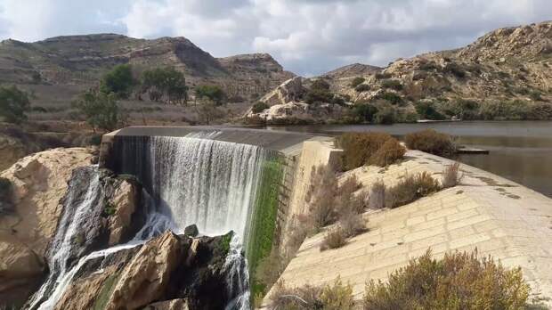Удивительно, что вода стекает с плотины. Хотя справа на фотографии тоже видны водопропуски. Они не работают, как и на плотине Тиби. Возможно, было принято решение закрыть их из-за изношенности и риска разрушения плотины. Но не было придумано ничего лучшего, как разрешить воде переливаться через ее край.