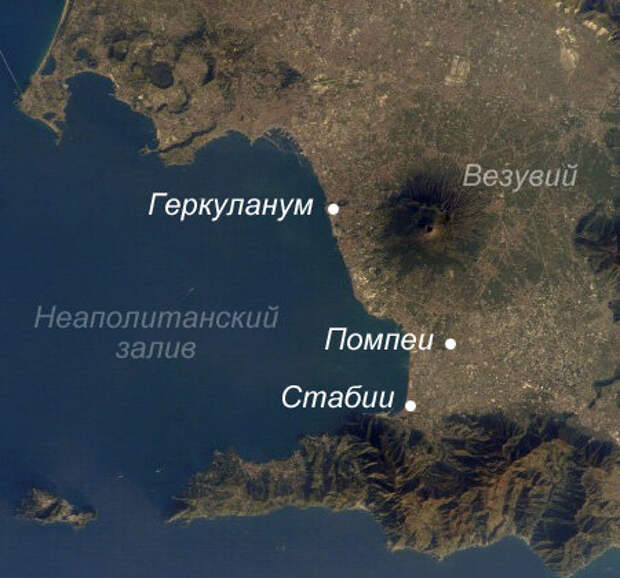 Еще менее известен город Стабии южнее Помпей. Неужели вокруг вулкана, который неоднократно извергался за тысячелетия и покрывал землю плодородным пеплом больше не существовало городов? Посмотрите современную карту: