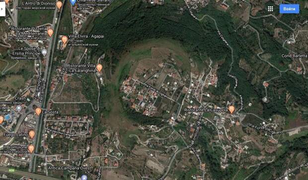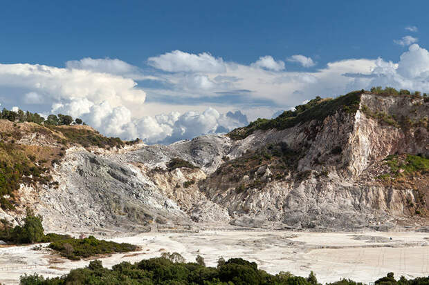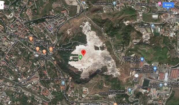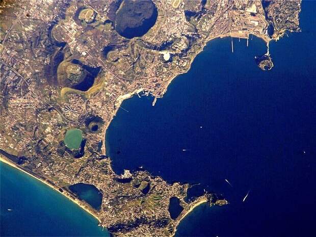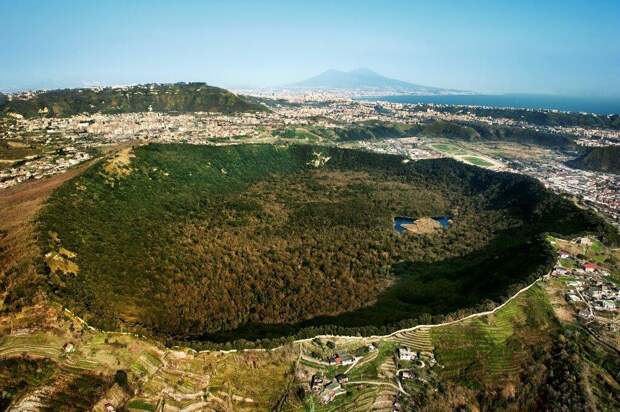 Множество конусов уснувших вулканов, кальдер и озеро, похожее на остатки обрушившегося конуса. А, может, часть из из них – это древние грязевые вулканы? Все они находятся в районе города Поццуоли. Ученые предполагают, что здесь находится жерло супервулкана наподобие Иелустонского.