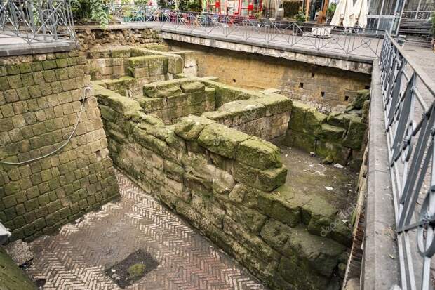 Руины якобы греческих стен на Пьяцца Беллини, в центре Неаполя. Безрастворная кладка больших блоков на глубине около 4-5 м. Что здесь делают греческие стены? Оказывается, весь юг Апеннинского полуострова, почти половина Италии – это древнегреческие колонии: