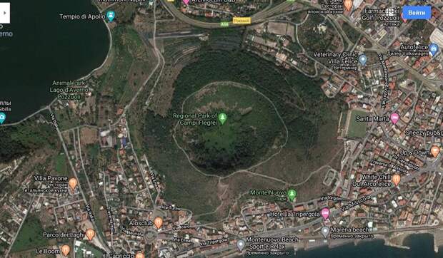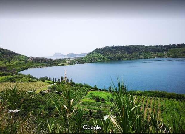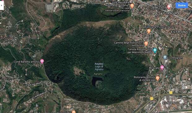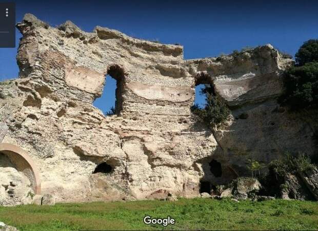 Circolo Golf Napoli. Поля для гольфа в кальдере одного такого древнего вулкана и вулканическое озеро Аверно. Рядом с озером в гугл-картах попалась интересная фотография развалин чего-то огромного: