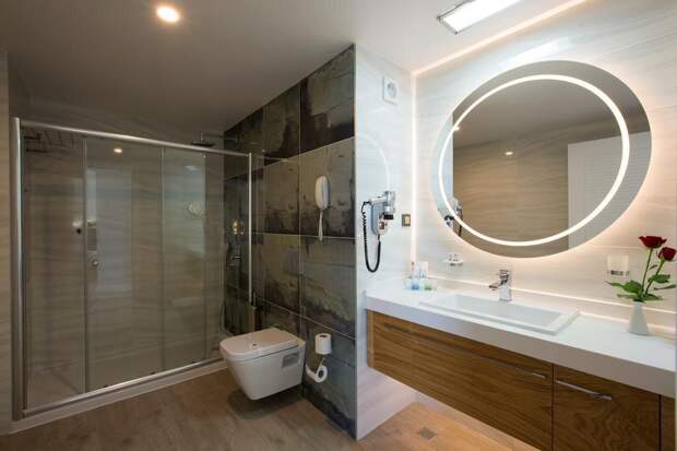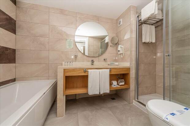 отеле Kirman Sidera Luxury and Spa 5* стандартный номерВ ванной комнате душ, унитаз, хорошо работающий фен, раковина и много различных принадлежностей для гигиены, которые пополняются ежедневно (зубная паста и щетка, бритвенный набор, расческа, пилочка для ногтей, мочалка для душа, ватные диски, гель для душа, лосьон для тела, шапочка для душа, мыло, шампунь, ватные палочки, салфетки). Бонусом к приятному отдыху будет наличие тапочек и халата.