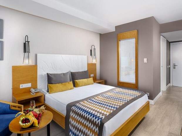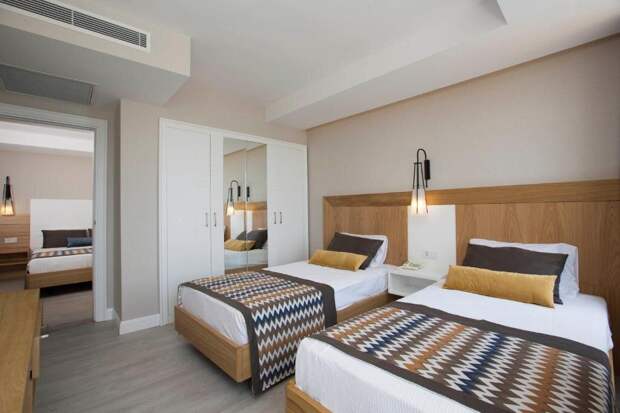 Всего таких номеров в данном отеле 51. Отличаются они только видом с балкона: на море, бассейн или сад. Номер двухкомнатный, поэтому размещение в таком номере 4+1 (дополнительно предоставят раскладушку).