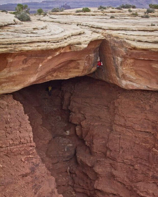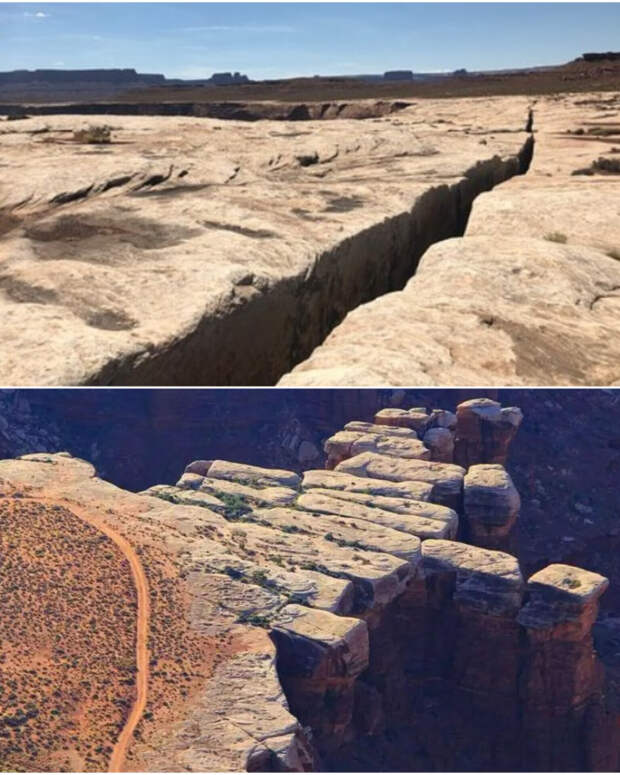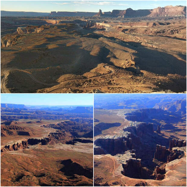 В национальном парке Каньонлендс в Северной Америке достаточно интересная геология. Это каньон, похожий на дно большого древнего водоема, озера. Это подтверждает и верхний осадочный слой, который сильно отличается от нижних, более рыхлых слоев (спрессованной глины с камнями). Верхний слой похож на разлитый бетон и представляет собой окаменевшие слоистые иловые отложения.