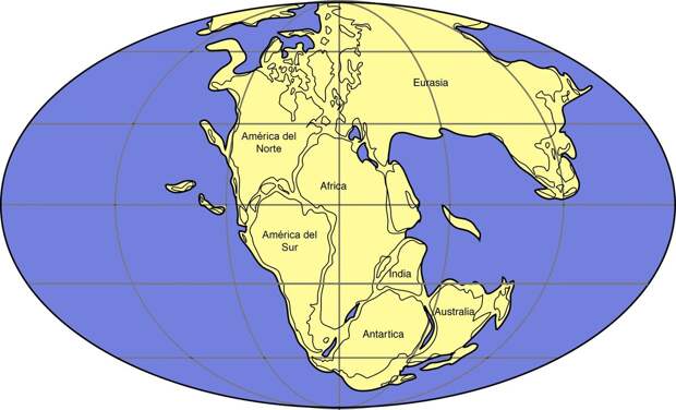 В теории тектоники литосферных плит существует модель суперматерика Пангеи, который существовал совсем недавно в геологическом времени - в позднем палеозое и раннем мезозое. А именно, 335 - 175 млн. лет назад.