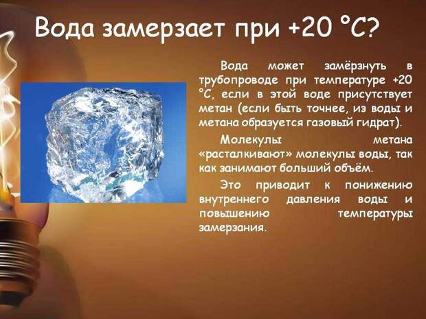 Оказывается, вода может замерзнуть при обычных условиях, при температуре +20 гр в еще одном случае – если в ней начнет растворяться метан.