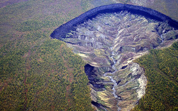 Батагайский провал в Якутии – одно из мест с очагом таяния вечной мерзлоты. Грунт проваливается после таяния льда на десятки метров вниз. Интересно, ученые замеряли уровень выделения здесь метана?