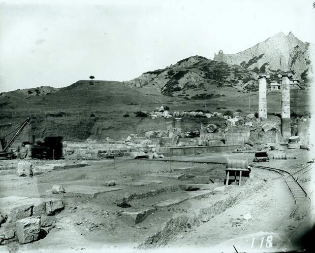 Раскопки проводили с помощью вагонеток и даже экскаватора (третье фото). Многие выдают этот прием археологов 19-20 вв. за древние железные дороги. Спешу их огорчить. Вагонетку видно на второй фотографии. Рельсы засыпаны грунтом при его перевозке, поэтому выглядят так, что и их раскопали.