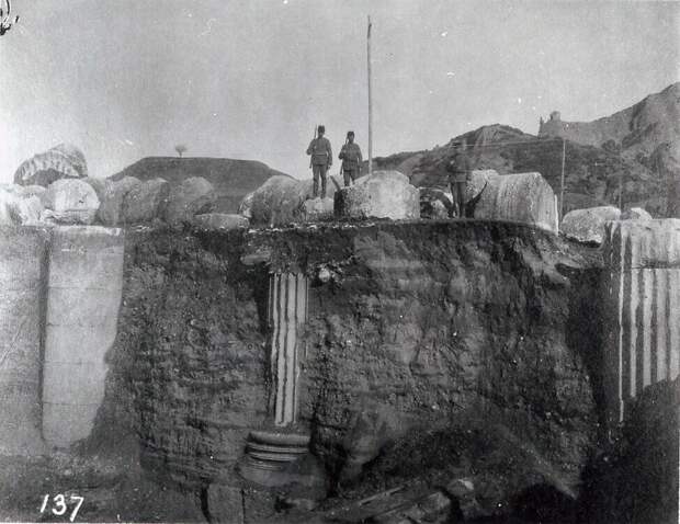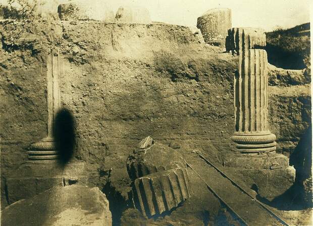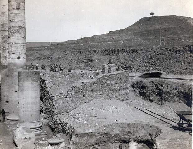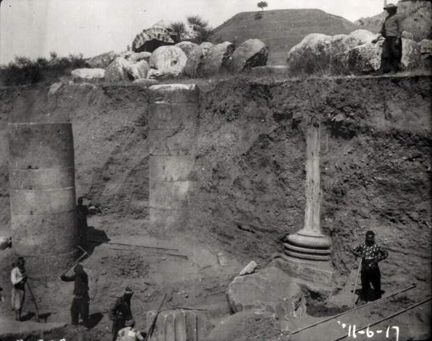 А, вот и нет! Здесь историки нас не смогут водить за нос. Т.к. их предшественники и коллеги археологи оставили для нас доказательства, что эта территория была завалена многометровыми слоями грунта. Вернее сказать, глины, камнями, а может и вперемешку с пеплом вулканов. Оказывается, сохранились фотографии раскопок, организованные командой Принстонского университета во главе с Говардом Кросби Батлером (по инициативе Д.Робинсона). Смотрим: