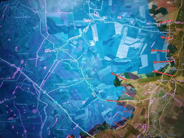 Подразделения группировки войск «Юг» продолжают наступление восточнее Краматорска и продвинулись на рубеже Кирово (Свято-Покровское) – Нелеповское на глубину 1-4 км на разных участках. Ожесточённые бои идут за господствующие высоты западнее Северска и в Кирово. Западнее Звановки, Кузьминовки, Переездного и Фёдоровки ВС РФ выбили противника из ряда опорных пунктов на господствующих высотах и продвинулись в глубину обороны противника до 4 км, создав угрозу обхода Резниковки и выхода к Рай-Александровке – Никифоровке с востока и северо-востока. Восточнее Никифоровки наши подразделения заняли западную часть леса Бабачий. Бои идут в восточной части Бондарного. Северо-восточнее Орехово-Васильевки наши штурмовые группы заняли опорный пункт противника на высоте у юго-восточной окраины Миньковки, пишет военкор Юрий Котенок.