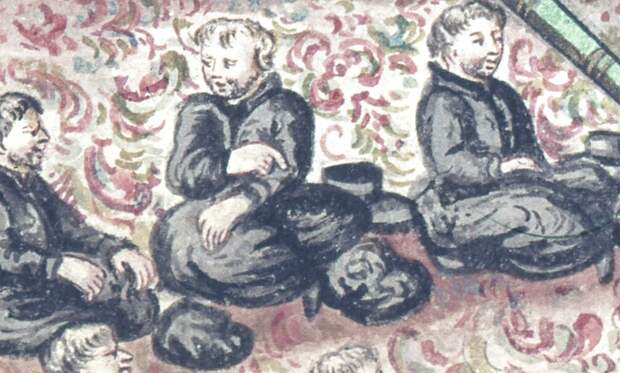 По одеждам видно, что это собрались монахи-иезуиты. Вокруг них прислуга, как говорят, челом бьет. Возможно, как раз прислуга из местного населения.