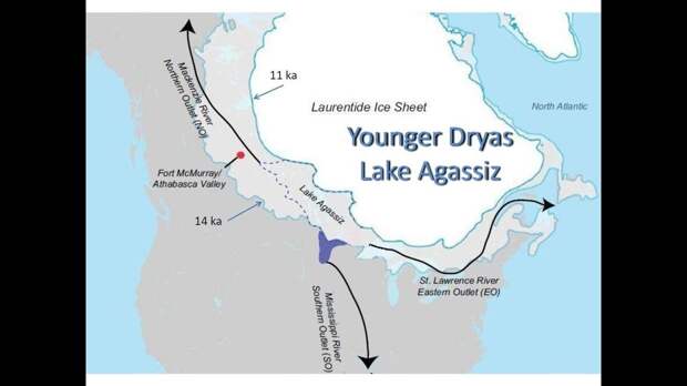 На этой карте отмечены направления потоков при наполнении озера. Озеро вытекло через реку Нельсон в Гудзонов залив. На его месте сейчас осталось ряд небольших озер. Хотя по другой информации, слив происходил катастрофически и на юг, через долину реки Миссисипи в Мексиканский залив.
