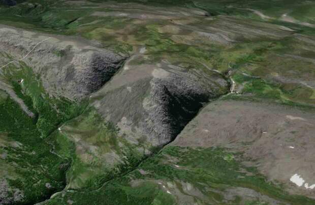 Мы видим, что ежегодно таящий ледник разрушает горный хребет с образованием так называемых цирков (округлых обрывов). Это не древние карьеры, как многим хотелось бы это увидеть в таких примерах.