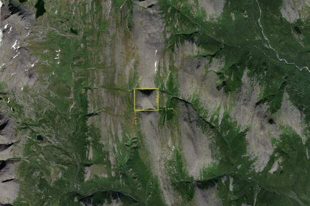 Если это природный объект, то как могла образоваться такой формы гора? Виден горный хребет (конус) и поперек него проходит два разлома. Если допустить, что по разлому порода осыпалась, то почему осыпалась наклонно под равными углами и в равных объемах, создав пирамиду? Длина каждого ребра – около 0,5 километра.
