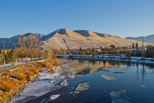 На склонах видны береговые линии (образованные водной эрозией террасы) ледникового озера Мизула на горе Сентинел, восточнее г. Мизула, шт. Монтана, США. А реки, которые вытекали из этого водоема, были гораздо полноводнее и их пойма была шире: