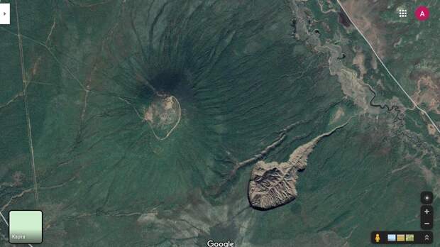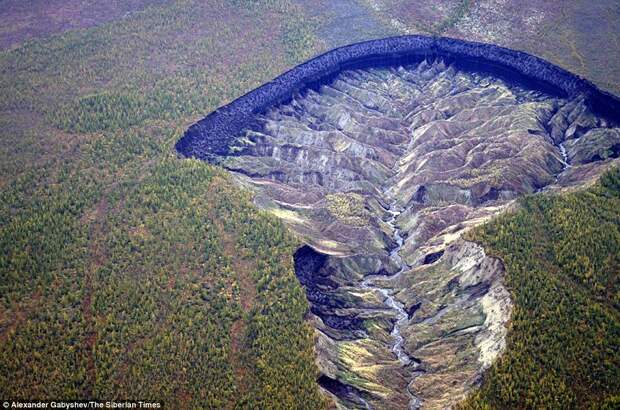 Так этот провал выглядит на космоснимках в настоящее время. По данным наблюдений – он растет примерно на 10 м в год. Сейчас его ширина составляет 3 км. И глубина – 100 м. Есть места стабилизации разрушений. Т.е. процесс по мнению геологов – не бесконечный. Хотя, вечная мерзлота повсюду.Вроде бы какие могут быть сомнения в природе этого объекта? Геология говорит: таяние вечной мерзлоты из-за вырубки лесов и глобального потепления - значит так и есть! Хотя, какое потепление из-за антропогенной деятельности могло быть в 50-60 гг. 20в. – об этом тоже никто не говорит.