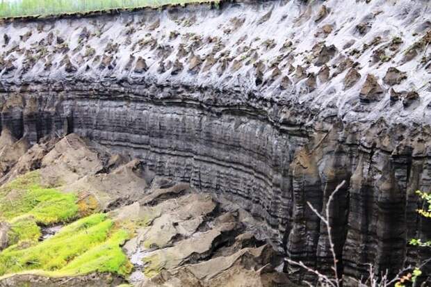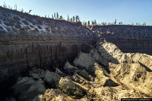 Первое, что бросается в глаза, когда смотришь на срезы грунта, так это то, что сам лед вечной мерзлоты имеет толщину над слоистым грунтом метров 30-40. Под ним промерзший слоистый глинистый грунт. Если бы растаял только верхний слой льда, то с чего бы промывать талой воде такую огромную промоину в промороженном грунте? А не похоже ли это все не на талую воронку, а на именно провал грунта?