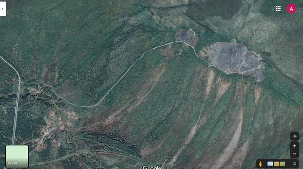 Чуть южнее провала находят разработки нашей цивилизации: шахта и отвалы. Только непонятно, почему отвалы так далеко вывозили от места добычи? И эту деятельность человека здесь подтверждает видео от человека, который там жил: