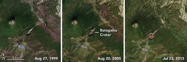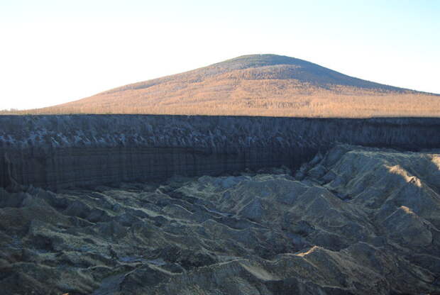 Самое интересное, что Батагайский провал находится не в низине, а выше чем поселок Эсэ-Хайя. И только после этого становится понятны космоснимки. Еще раз посмотрите на них. Рядом с провалом есть множество оврагов, образованных когда-то от стекающих по склонам потоков от таящих снегов. И только этот сделал термокарст! Нет, это похоже, именно на провал грунта и последующее разрушение склонов как от гидромонитора в карьере. А гора – отвалы от добычи в течении сотен лет.