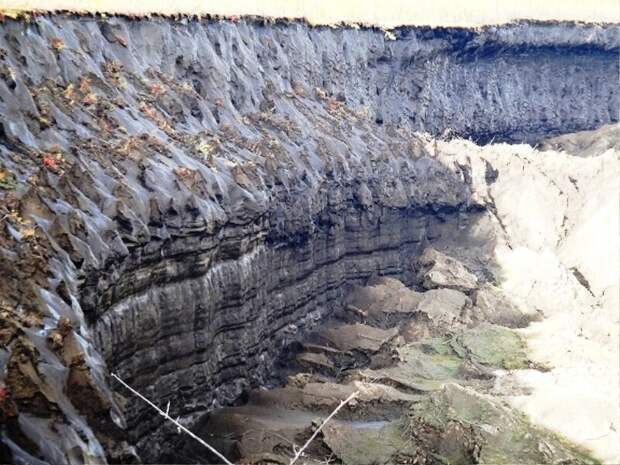 Представьте, что внутри земли находятся полости (искусственные или при родные) и каким-то образом грунт начал обсыпаться в них. А потом туда в летнее время устремилась и талая вода. Но пустоты были не вертикального залегания, а горизонтального – как угольные забои. Все начало рушиться как карточный домик или «змейка» из домино. Вот тогда такой вид якобы термокарста объясним. По какой причине это все начало таять или обрушиваться именно в наше время? Может вечная мерзлота не такая древняя? Как минимум: это не термокарст, а именно провал.