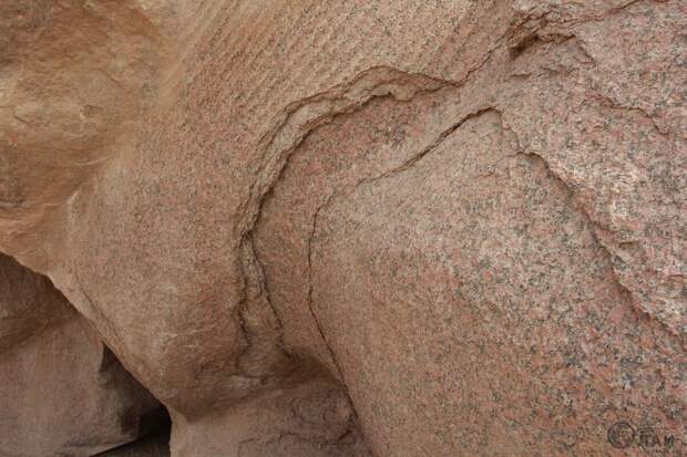 В нижней части статуи есть такое место со странными сколами. Здесь отслаивания на граните повторяют контур самой статуи. В любой породе, если встречаются слои, то их видно. Они могут пересекать весь массив пластами, прожилками. Но отслоения на этой статуи похожи на штукатурку. И они говорят о возможной технологии изготовления. Например, ее лепили из пластичных масс, обмазывая слой за слоем.