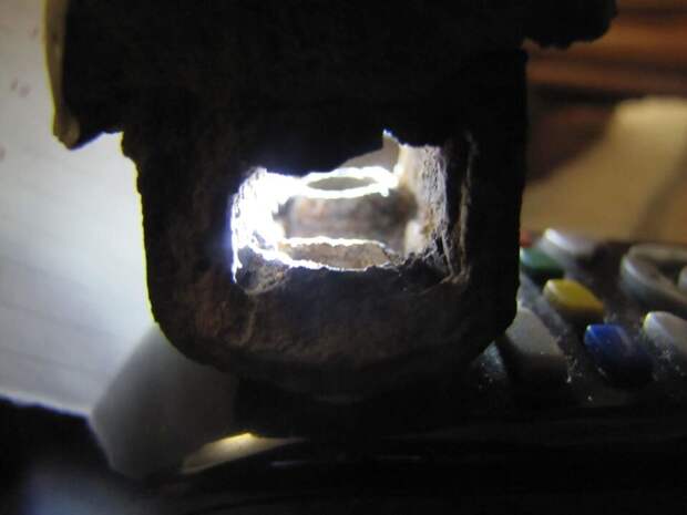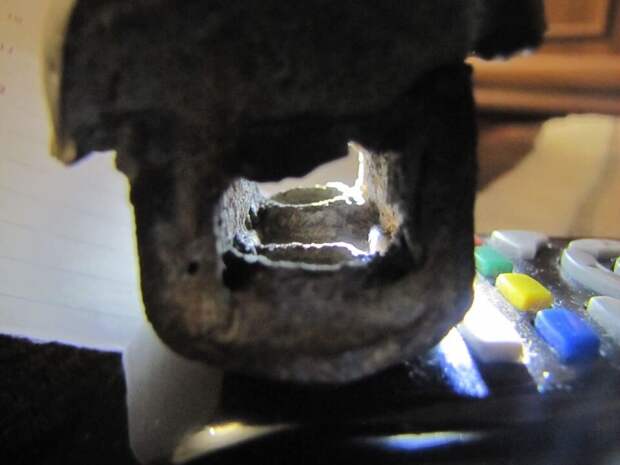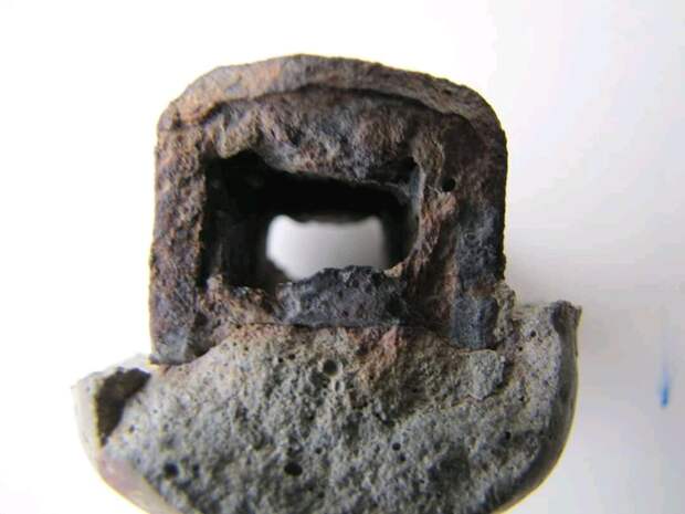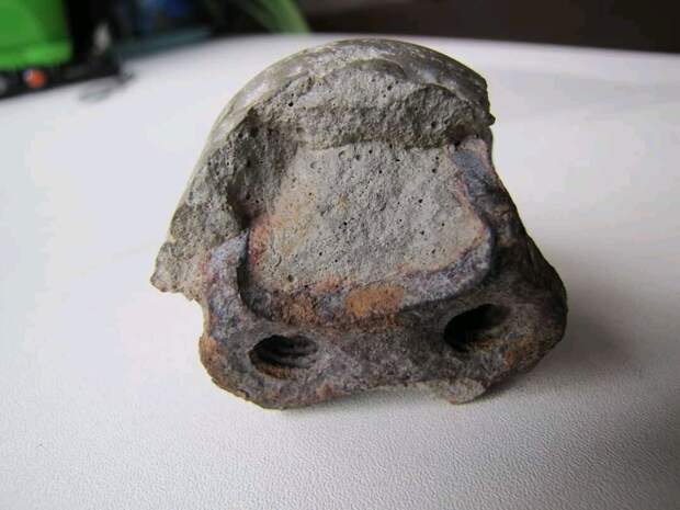 В отверстиях видна резьба. Это к тому же еще и технологичное изделие. А внутренняя резьба, как известно, сейчас нарезается инструментом из более прочных сплавов. Так же обратите внимание на структуру породы, в которой находится металл. Она пористая. Судя по тому, что металл внутри этой породы – тоже покрыт ржавчиной, следовательно возраст детали не пара лет.