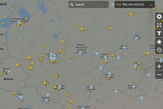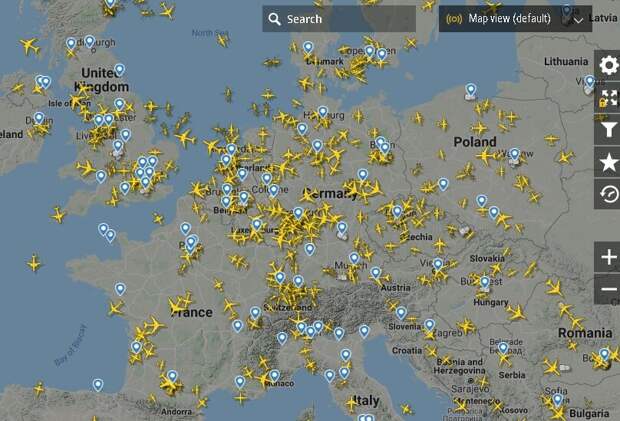 Начнем с России. Видно много транзитных и грузовых бортов через нашу территорию. Внутренние рейсы – единицы. Есть частные вылеты. Есть даже загадочные, без информации о бортах. В любом случае, самолеты взлетевшие с российских аэропортов можно пересчитать чуть ли не по пальцам. А что с авиасообщением в Европе?