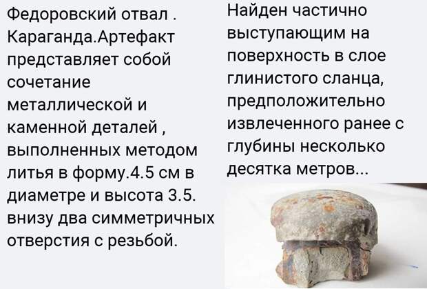 Один участник группы в facebook поделился уникальными фотографиями найденного артефакта (изделия дело рук человека), но в очень необычном месте. Изделие из металла (по фотографии - железа), залитого в камень найдено в отвалах пустой породы в Федоровском угольном разрезе около г.Караганда (на севере Казахстана).