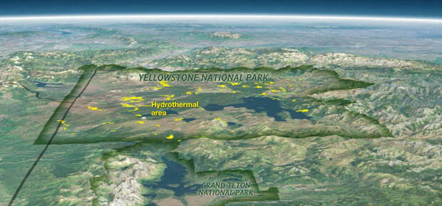 Самый известный из этого списка - Йеллоустонская кальдера. Это не вулкан в классическом понимании. Это даже не высокая кальдера, а территория с геотермальной активностью. Ее размеры приблизительно 55х72 км.