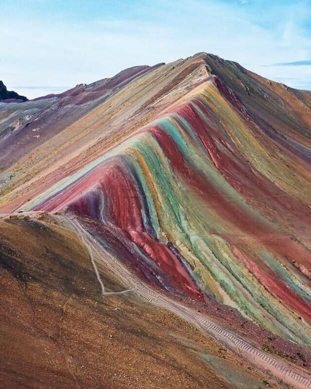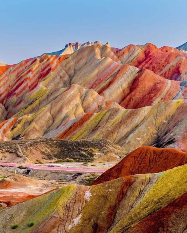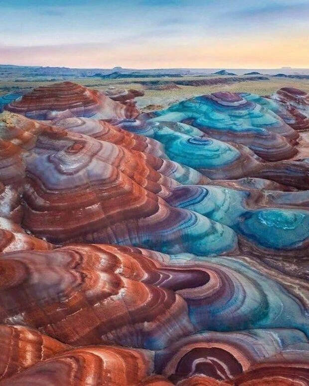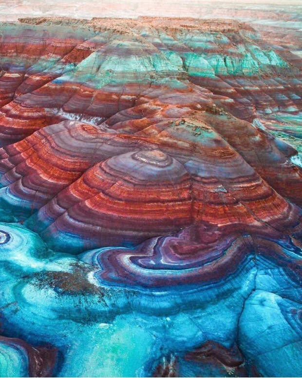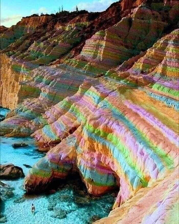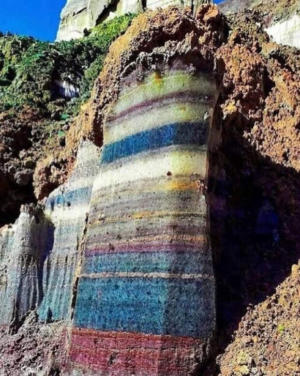 Фантастические по красоте осадочные слои разных оттенков. Но как они образовались? Каждый цвет - это отдельный минерал или порода с содержанием оксида металла. Красный - железа, зелёный - меди. Считается, что это отложения в древних морях. Получается, в одно время в воде было много одного металла, потом другого?