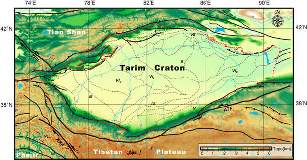 Более детальная научная модель образования Таримской низменности – это теория кратонов. Кратон – устойчивая платформа континента. Здесь более толстая литосфера (твердая кора), достигающая толшины 150-200 км, а иногда и 400 км. Тогда как в других местах она может быть всего 35-45 км. Над кратонами еще располагается осадочный слой толщиной 3-5 км.