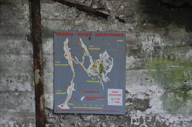 Перед спуском размещен план пещеры. Сам вход перегорожен железобетонной стеной с железной дверью.