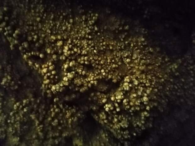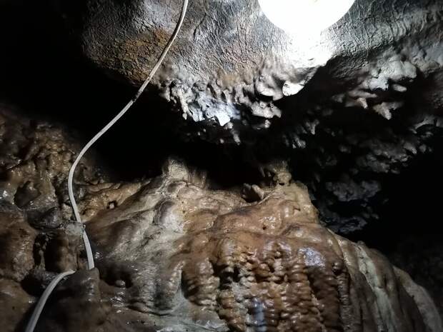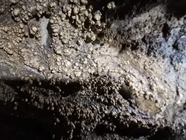 Но следов стекающей воды с растворенными минералами много. Из нее откладывается налет из кальциевых соединений с полевым шпатом (глиной). Есть много мелких и больших сталагмитов в виде конусов.