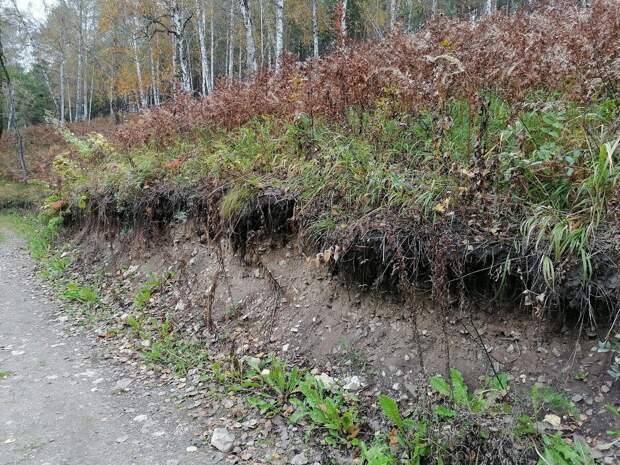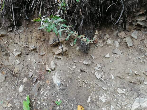 На обратном пути после посещения пещеры обратил внимание на срезу грунта, образованный после прокладывания дороги. Под дерном расположен щебень с глиной. Именно такие массы откладываются после селевых потоков без длительного их движения. Если массы двигаются многие километры, то камни обкатываются и превращаются в галечник.