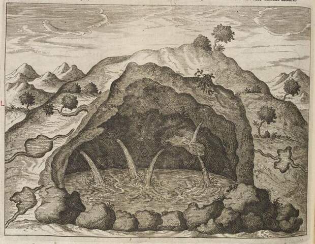Строение Земли Афанасий Кирхер представлял как совокупность полостей с огненной мантией и подземными полостями с водой: