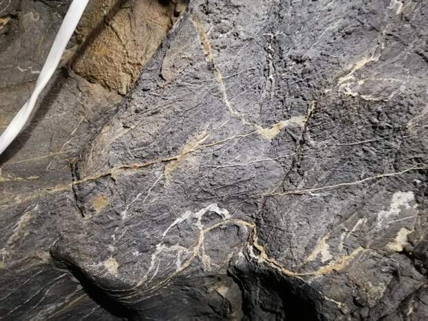 Интересными показались образования на сводах в виде мелких шариков. Почему именно в такой форме? Микро-конкреции. Некоторые породы пронизаны сеткой из другого цвета минералов.