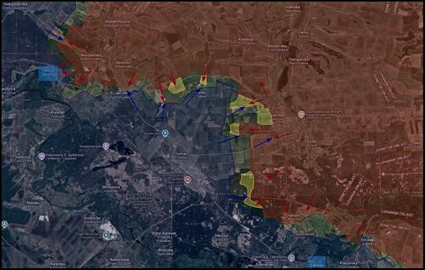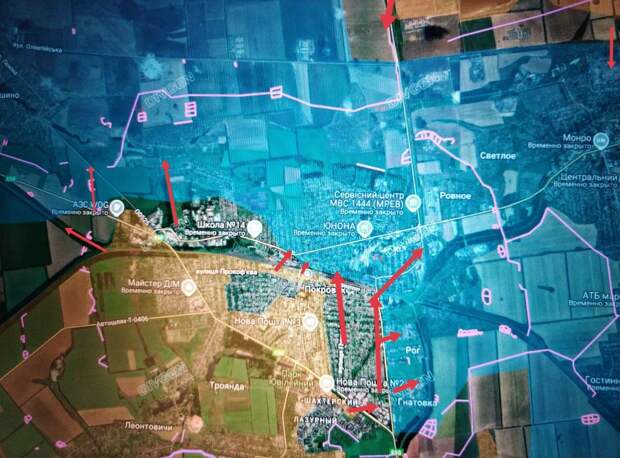 Существенных изменений нет. Противник, по всей видимости, подтянул резервы. На северном фланге продолжаются попытки инфильтрации в районе Дроновки. Ранее сообщалось о закреплении на восточных и северных окраинах, однако подтверждения визуальными материалами пока нет.