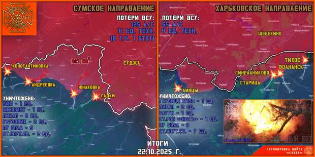 Подразделения группировки войск «Север» нанесли поражение формированиям четырёх механизированных, егерской бригад, штурмового полка ВСУ и бригады теробороны в районах н.п. Варачино, Искрисковщина, Кондратовка, Корчаковка и Ленинское Сумской области.