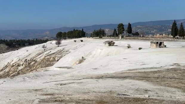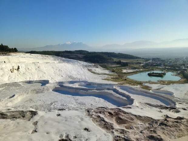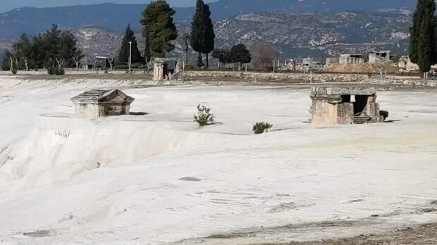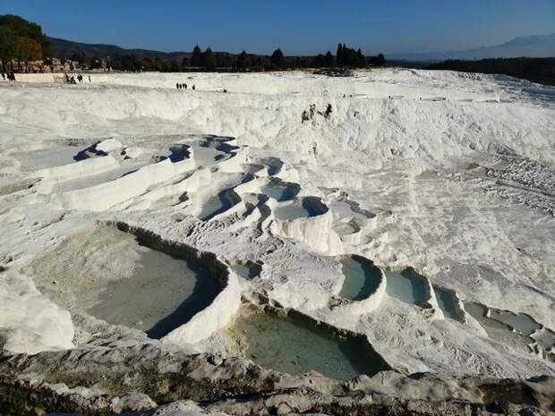 Туристы, которые бывают в Турции, часто посещают красивое место под названием Помуккале. Это белоснежные известковые отложения, образовавшиеся от воды с большим содержанием солей кальция: