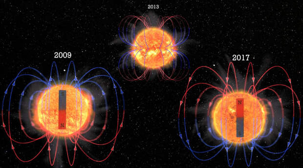 Магнитное поле Солнца меняет свое направление каждые 11 лет. И с этим связаны циклы солнечной активности. Почему именно 11 лет? Почему максимум солнечной активности длится 4 года и затухает? На эти вопросы нет ответов.