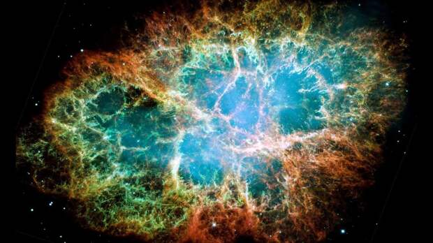 Но такие взрывы новых и сверхновых звезд в конце своей жизни мы видим крайне редко. В 1054 было такое событие: в созвездии тельца вспыхнула сверхновая, на месте которой сейчас Крабовидная туманность и пульсар в центре туманности: