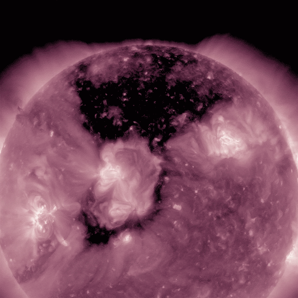 Во время солнечной активности поверхность короны Солнца покрывается пятнами, перестает излучать в рентгеновском диапазоне и космические зонды снимают вот такую картину.