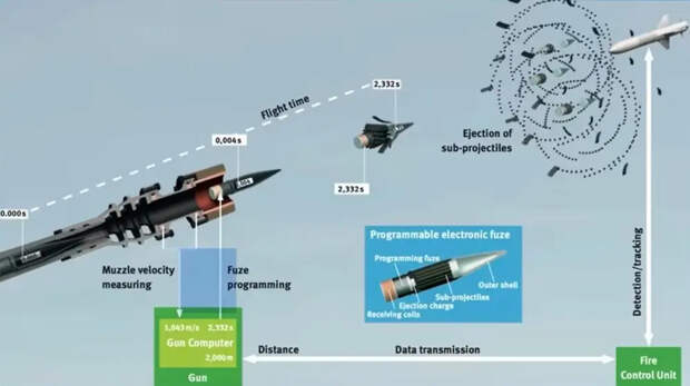 Снаряд взрывается на точно рассчитанной дистанции посредством установки электронным таймером, запрограммированным при выстреле, необходимого момента взрыва.