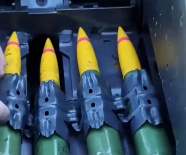 Снаряды HEI-T 35х288. Жёлтый цвет указывает на осколочно-фугасный тип, красная полоса - трассирующий