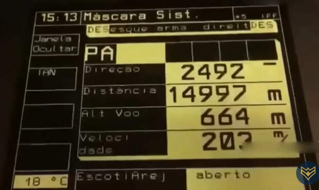 Дисплей аппаратуры обнаружения и сопровождения цели. Примечательно, что у данной ЗСУ информация подаётся на испанском языке. Видно, что обнаружение цели происходит на максимальной дальности 14997 метров, при высоте цели 664 метра и скорости 203 м/с, то есть примерно 731 км/час.