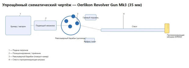 В отличие от многоствольных револьверных пушек, работающих по принципу Гатлинга, эти орудия одноствольные, но оснащённые четырёхкамерным револьверным механизмом, наподобие классического револьвера.