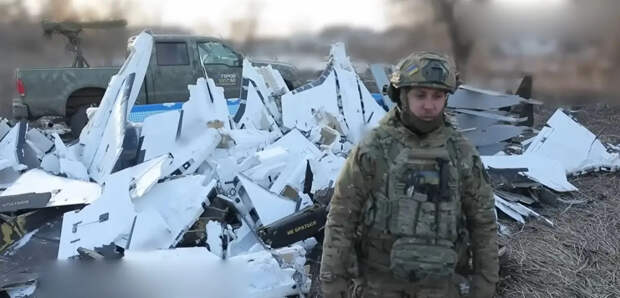 Боец ВСУ на фоне сбитых российских беспилотников. Где сделан этот снимок и откуда свезли в одну кучу эти обломки, неизвестно, но без сомнения, на фото запечатлены «Герберы»-обманки. Вид у «хероя» не очень радостный...